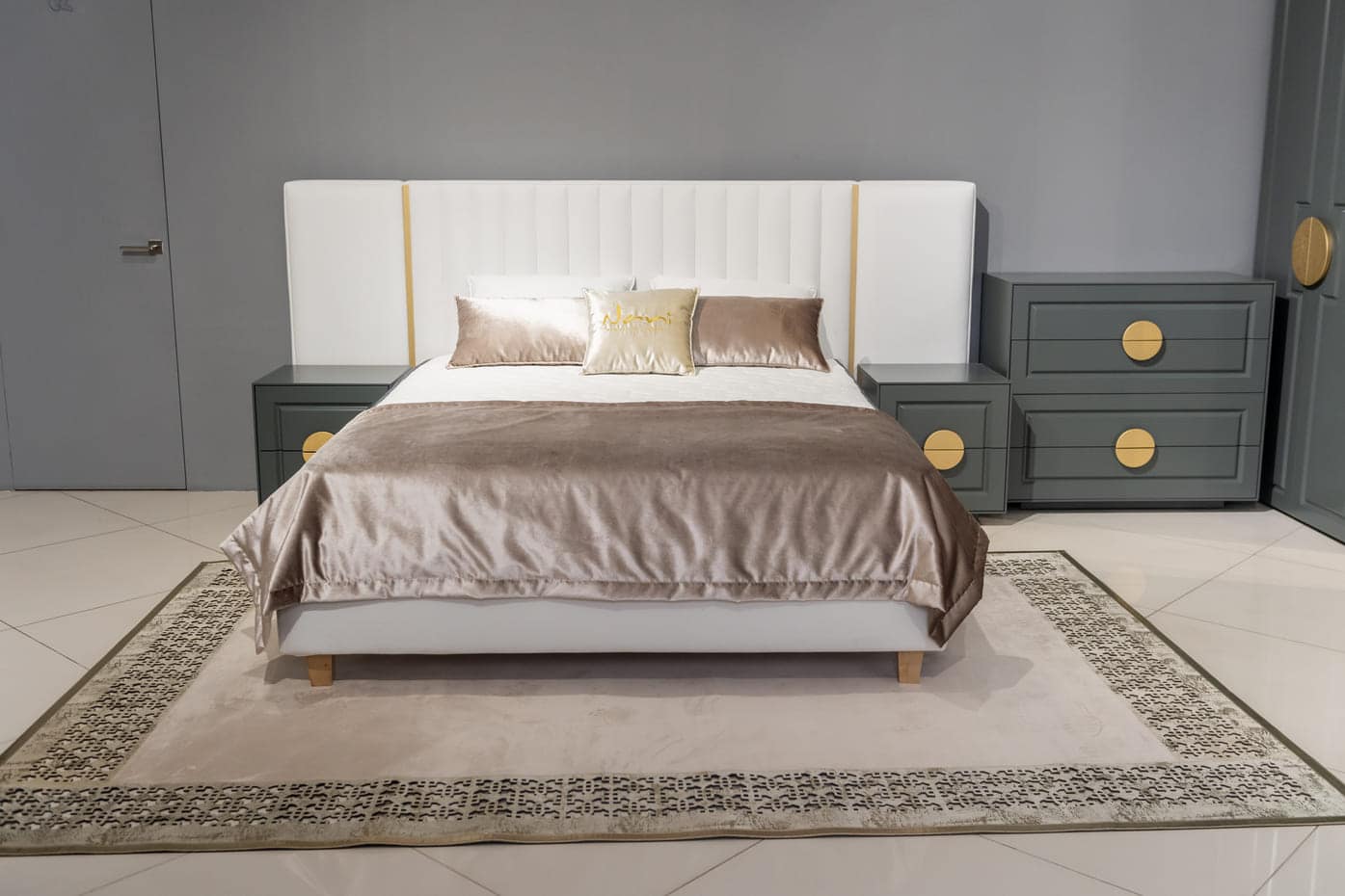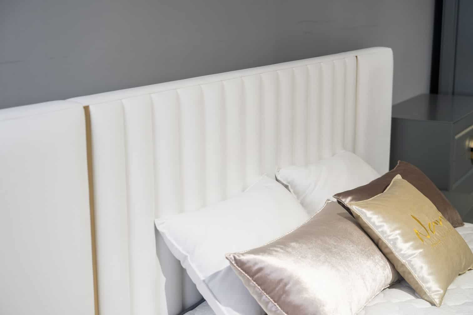 Кровать Milano обита бархатной тканью с мягким изголовьем, а линии спинки сочетаются с молдингами на корпусе мебели этого гарнитура. Цвет ткани можно выбрать из широкого спектра. Боковины кровати покрыты съемным чехлом, который очень легко чистится. Размеры 250x220cm, 270x220 cm, 290x220 cm, 310x220 cm Спальное место 140x200 cm, 160x200 cm, 180x200 cm, 200x200 cm Место для хранения нет Материалы ДСП/Дерево/Ткань/Полиуретан/Ламели Гарантия 24 месяца
