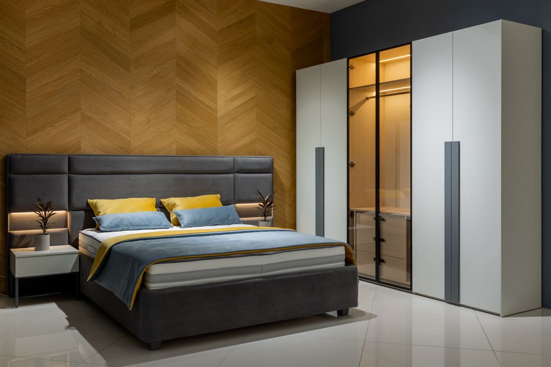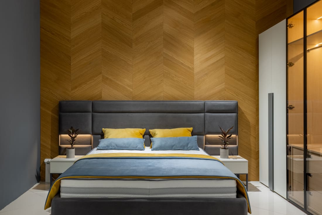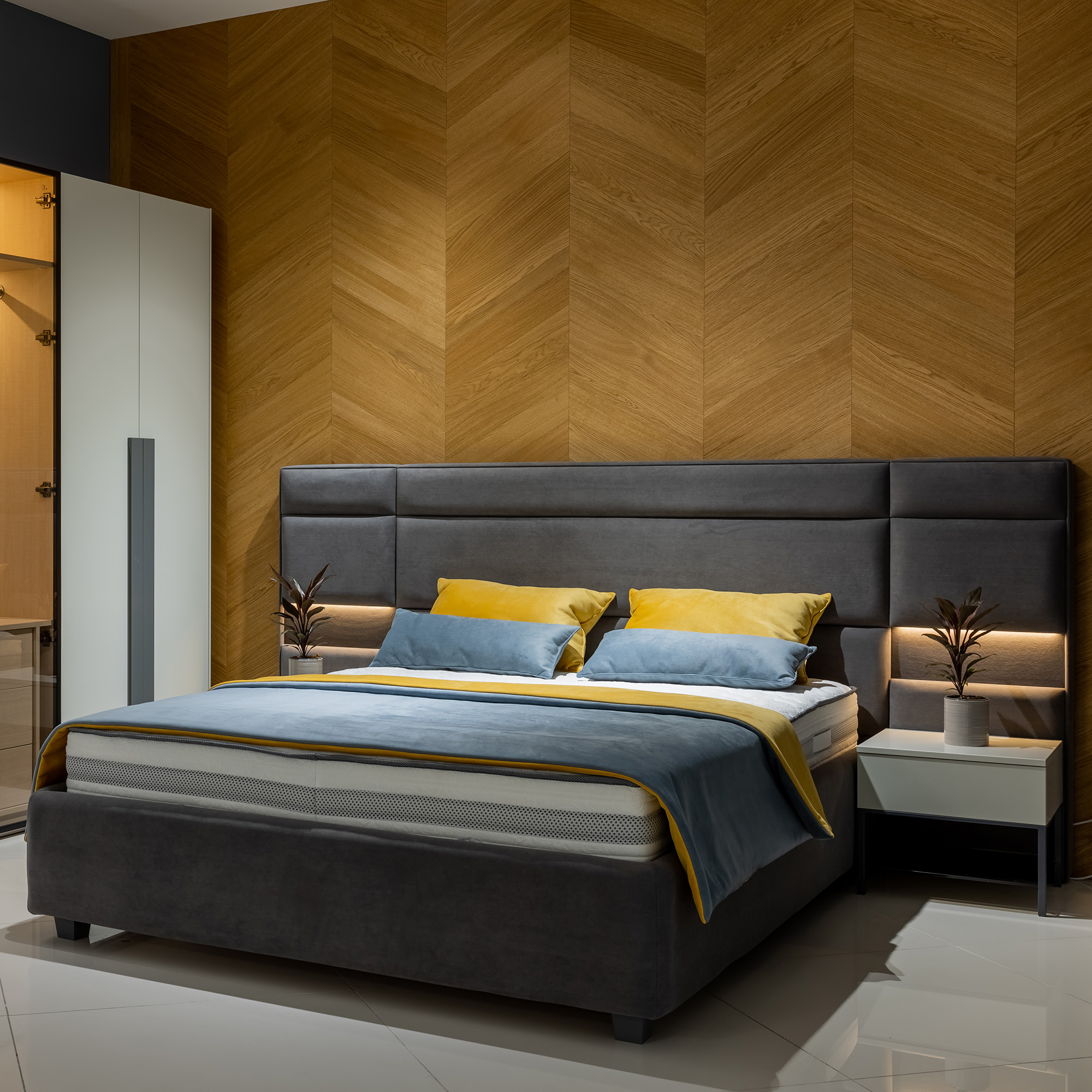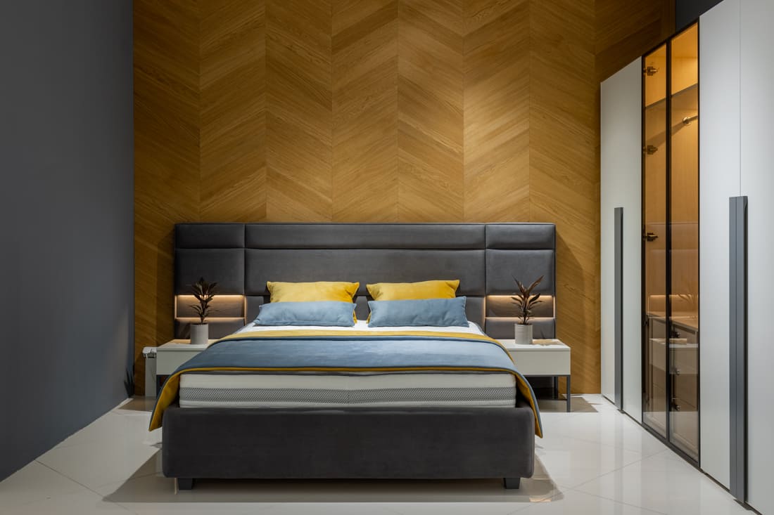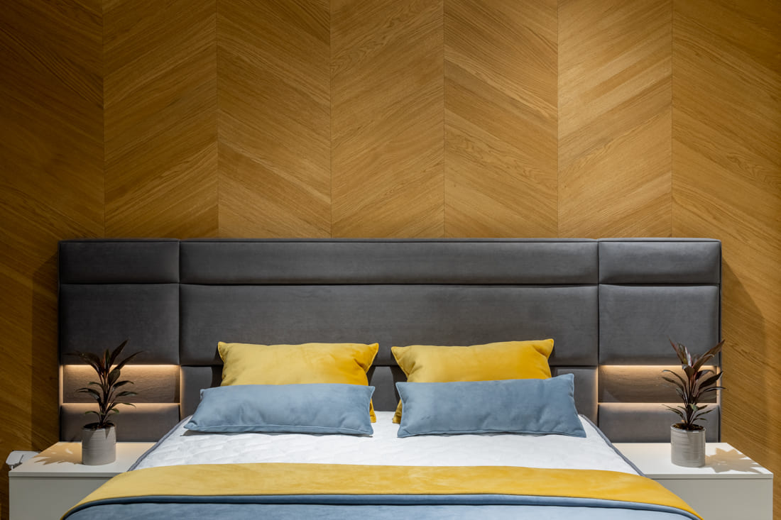 Milton выполнен в современном стиле с золотистыми металлическими элементами, которые придают ему роскошный вид. Кровать обита бархатной тканью, оттенок можно выбрать из широкой палитры. Изголовье слегка изогнутое и эргономичное, боковины покрыты съемными чехлами, которые легко чистить в любое время. Кровать оснащена вместительным ящиком для хранения, элементы которого можно легко вынуть, что делает возможной полноценную уборку даже под кроватью. Каркас кровати выполнен из металла с ламелями из натурального дерева, которые сохраняют ортопедические свойства матраса.